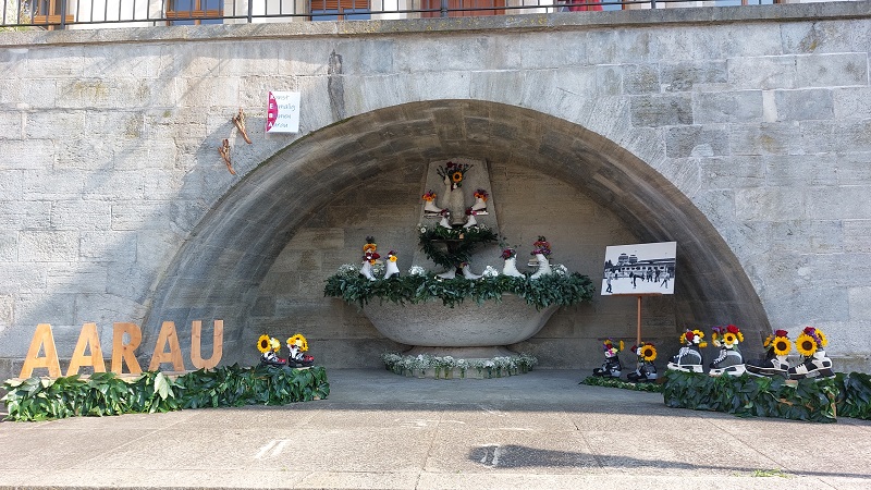 Am diesjährigen Aarauer Maienzug hatte die KEBA einen besonderen Auftritt. Die Blumenfrauen Kathrin Bachmann, Melanie Eberhardt, Diana Eberhardt, *Mareile Eichinger, Fiona Hasler, Katharina Bruckner mit Baby Tim, Dagmar Lindermann und *Tamara Barth haben liebevoll den Brunnen beim Aargauer Kunsthaus mit antiken Schlittschuhen, historischen Bildern und wunderschönen Blumen als Hommage an die Kunsteisbahn geschmückt. Das Ergebnis war einfach grossartig und bereitete allen eine grosse Freude. Der Verwaltungsrat, die Geschäftsführung und das Personal bedankt sich herzlich bei den Blumenfrauen, denen es wichtig war, die KEBA als wichtiger Bestandteil der Region zu präsentieren.